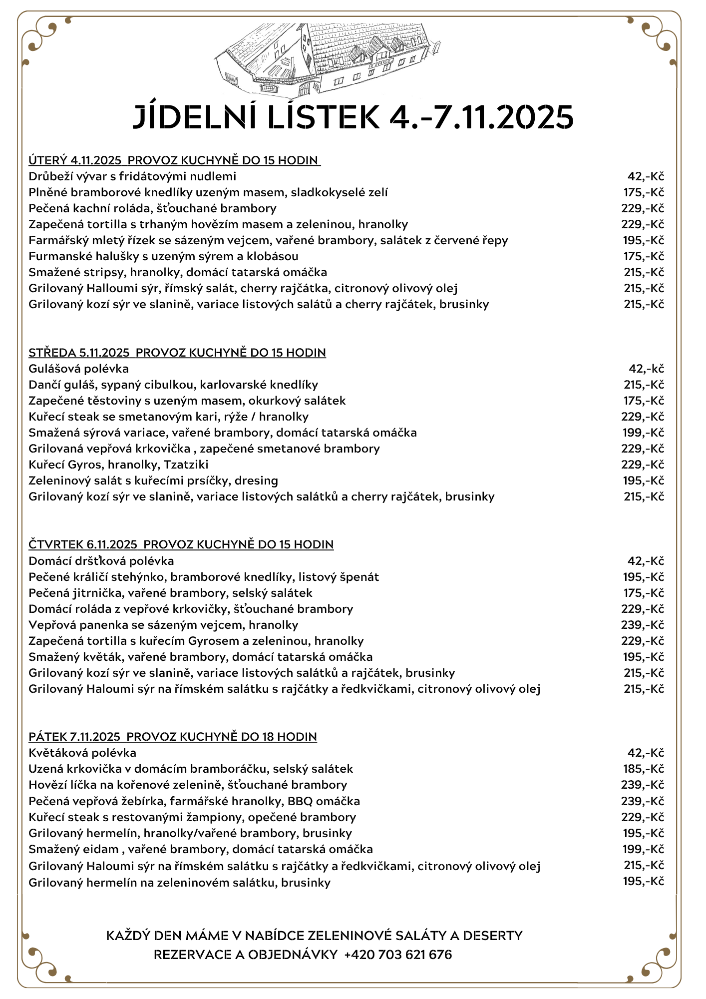 Provoz kuchyně úterý, středa, čtvrtek, neděle 11 - 15 hodin. Pátek a sobota 11- 18 hodin.